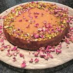 Nel frattempo aprite le bacche di cardamomo e ricavatene i semi e pestateli in un mortaio o con un batticarne. Tritate i pistacchi (lasciatene da parte una manciata per la decorazione) e scaldate il latte di mandorla con lo zafferano. Sbattete lo yogurt con lo zucchero fino adottenere una crema gonfia e chiara. Unite delicatamente anche la farina di mandorle, il semolino e il lievito, poi i pistacchi tritati, il cardamomo, il latte aromatizzato allo zafferano, la scorza di limone grattugiata e due cucchiai di acqua di rose. Mettete l’impasto in una teglia di diametro 23 cm ben imburrata sui bordi e con la base rivestita di carta forno. Fate cuocere a 180° per 45′, poi estraetela dal forno e lasciate raffreddare. Intanto preparate lo sciroppo all’acqua di rose, portando ad ebollizione tutti gli ingredienti e fare sobbollire per 5/10 minuti a fuoco medio. Quando si sarà raffreddata spennellate la torta con lo sciroppo e servite, decorando con pistacchi tritati e petali di rosa.