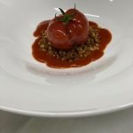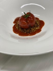 Uno dei suoi cavalli di battaglia è il “Finto pomodoro con all’interno una polpetta di sarda, salsa all’anciova. Alla base una finta terra realizzata con crumble di pane nero” di cui, di seguito, vi riportiamo la ricetta.