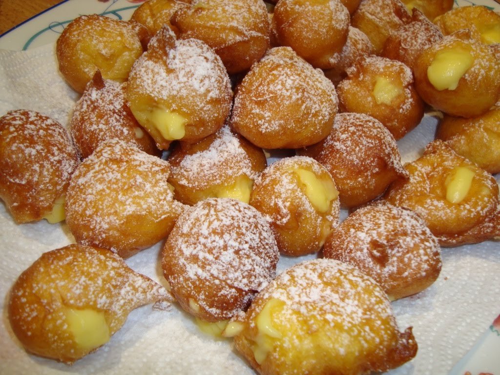 Per la crema di vaniglia: In una ciotola amalgamate i tuorli alla farina e l’amido con poco latte.Fate bollire il restante latte con lo zucchero. Quindi unite i due composti e fate cuocere con la bacca di vaniglia fino a portare a bollore mescolando di continuo. Una volta raffreddata riempite una sac a poche e farcite le brighelle bucandole con il beccuccio.Spolverate con zucchero a velo vanigliato.