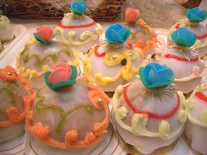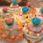 Procedete come nella ricetta precedente, ma cuoceteli una volta sola a fuoco medio e fino a quando sono cotti ma morbidi. Tagliateli a metà e farciteli di conserva. Preparate la glassa con 100 gr di zucchero a velo e due cucchiai di acqua, mescolando fin quando non risulta piuttosto densa e, dopo averli spennelati di conserva, ricopriteli interamente con la glassa di zucchero. Decorate, infine, con i confetti, le caramelle, e cioccolatini. Lasciate asciugare.