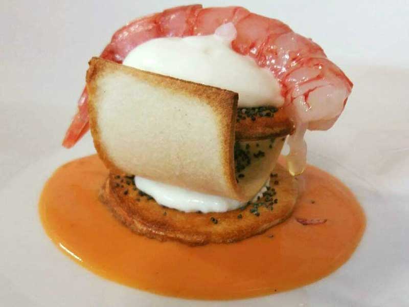 Gambero rosso marinato su foglia di cannolo, ricotta, crema di pomodorini gialli
