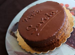 Adesso potete costruire la torta: inumidite il primo disco con la bagna, spalmate un po’ di crema e poggiatevi sopra un altro disco. Procedete con uno strato di pan di Spagna e uno di crema, bagnando di rum ogni disco tranne l’ultimo. Con l’aiuto di un piattto ritagliate i bordi per renderli uniformi. Quindi mettete la torta a riposare in frigorifero per circa 30 minuti.
