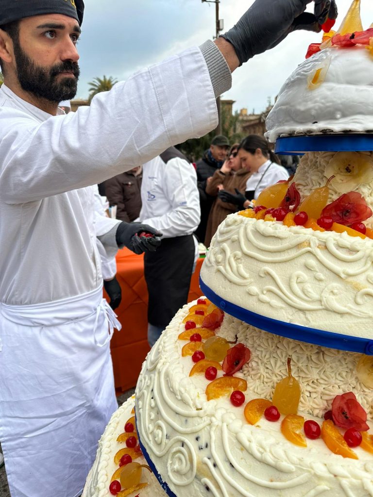 L’evento, si è svolto lo scorso 13 gennaio a Palermo in Piazza Giuseppe Verdi, ai piedi della scalinata del Teatro Massimo ed ha rappresentato un connubio tra tradizione e audacia gastronomica che ha messo in risalto la maestria dello Chef Catalano e della sua brigata di giovani nel reinterpretare il più classico ed appariscente dolce della tradizione siciliana. “Quest’anno sono i 400 anni del Festino in onore di Santa Rosalia – afferma Il vicesindaco Carolina Varchi- possiamo già darci appuntamento per quella data con gli emigrati nel mondo come occasione per ritrovarsi e ritrovare la dimensione di quella Palermo che non lascia indietro nessuno nel nome di una grande donna, Santa Rosalia.”