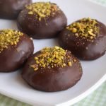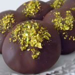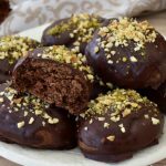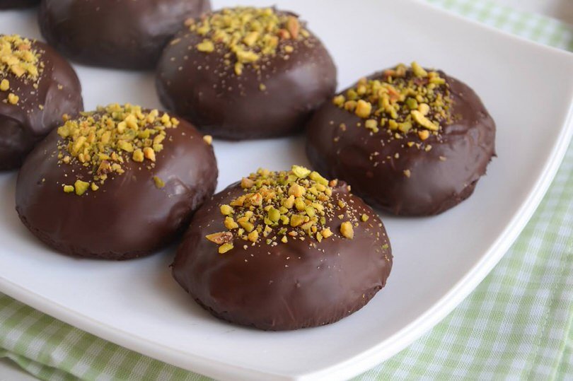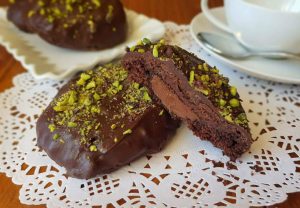 Una volta cotte, lasciatele raffreddare a temperatura ambiente. Nel frattempo preparate una glassa tiepida di cioccolato e burro fusi a bagnomaria con cui le decorerete una volta fredde, e le cospargerete con un po’ di granella di pistacchi per servirle quando la glassa si sarà asciugata.
