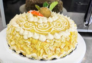 Quando saranno cotte estraetele dalle teglie e lasciatele raffreddare. A questo punto procedete con una fetta di pandispagna spruzzato con uno sciroppo agli agrumi (preparato facendo bollire delle bucce di Papeda e di arance con acqua e zucchero in uguali parti ) su cui stenderete uno strato di crema e delle fragole a pezzettini, e poi alternerete con un altro strato di pandispagna, bagna, crema, pesche e ananas sciroppati fino a chiudere con altro pandispagna e altra crema.