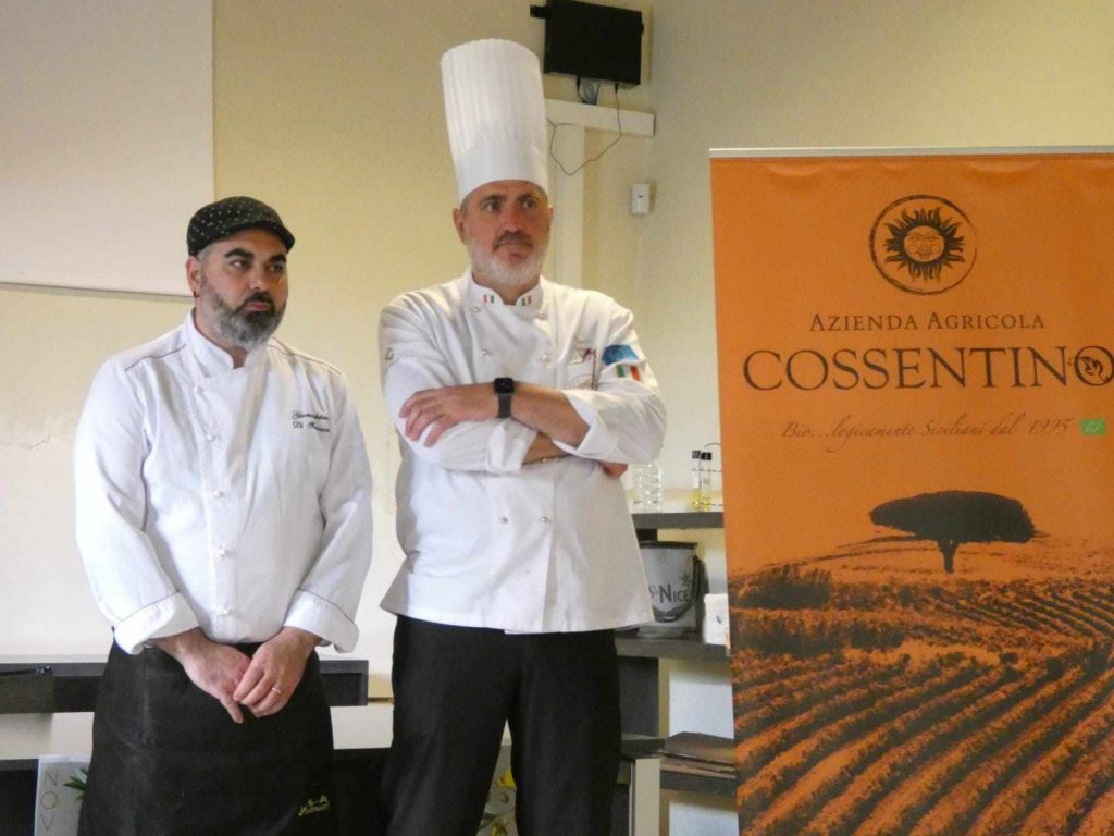In occasione del press tour dedicato alla stampa, sabato 11 novembre, presso la Real Cantina Borbonica di Partinico, è stato preparato un pranzo didattico che ha avuto il compito di dimostrare ai giornalisti e alle autorità presenti, la versatilità in cucina di un prodotto come l’olio extravergine d’oliva, ormai considerato a tutti gli effetti un ingrediente e non più un semplice condimento. Lo sanno bene Gioacchino di Franco e Paolo Antico, rispettivamente lo chef e il pastry chef, quest’ultimo titolare della pasticceria ‘Dolce Idea’ di Partinico (PA), a cui è stato affidato il delicato compito di preparare il menu tematico sull’olio. Per iniziare è stata proposta una entrée a base di gelato di pomodoro, peperoni, zucchine e menta su un crostino condito con olio extravergine d’oliva ed estratto di sedano. L’antipasto ha visto come protagonista le cicerchie, legumi di antica tradizione, spesso dimenticati, in questo caso serviti in una zuppa condita con olio extravergine d’oliva e crostini di pane. Il primo piatto ha proposto dei ravioli ripieni di patate viola, porri e formaggio conditi con pomodorini datterini, olio extravergine d’oliva e polvere di olive. Il secondo, sia quello a base di carne di coniglio lardellato ripieno di sasizza pasqualora che quello vegetariano, costituito da un tortino di verdure e formaggio, è stato accompagnato da un contorno di cavuliceddi e zucca rossa conditi con olio extravergine d’oliva. Come dessert un morbido e profumato plumcake all’olio d’oliva con glassa al cioccolato, olio e buccia di arancia e, in chiusura, il cioccolatino la Dolce Vita con cioccolato fondente ripieno di olio d’oliva, ganache alla nocciola e Bayles. I piatti sono stati abbinati ai vini biologici della cantina Cossentino di Partinico.