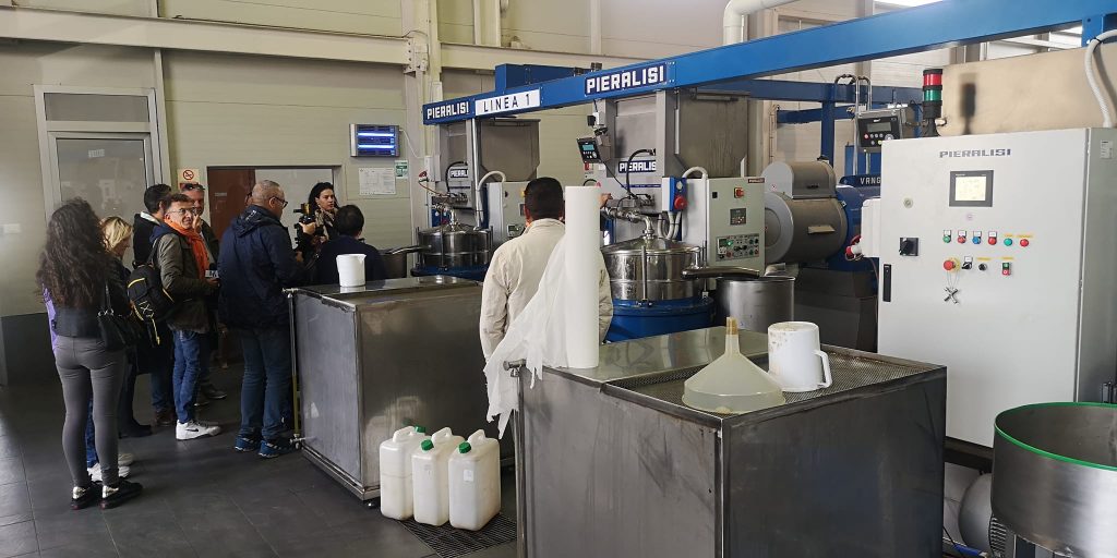 Il tour dedicato alla stampa è proseguito con la visita all’azienda olearia Bacchi, realtà che nasce dall’esperienza dei soci nel settore oleario tramandata da ben tre generazioni. Gli uliveti di proprietà sono estesi su una superficie di circa 40 ettari, in una zona collinare esposta al sole che esalta le caratteristiche organolettiche dell’olio. Il nuovo frantoio realizzato si avvale di tre linee di lavorazione delle olive, con una capacità di molitura di 10.000 kg di olive /ora ed una capacità di stoccaggio di olio di 200.000 kg. Grazie a macchinari tecnologicamente avanzati ogni fase di estrazione dell’olio viene seguita con cura, nel pieno rispetto dell’ambiente, riuscendo a mantenere inalterate le caratteristiche organolettiche e nutrizionali. Vengono così selezionati alcuni dei migliori oli siciliani, provenienti sia da uliveti aziendali che da quelli dei clienti, grazie alla conoscenza del territorio, degli uliveti, delle fasi di maturazione delle olive e di estrazione dell’olio.