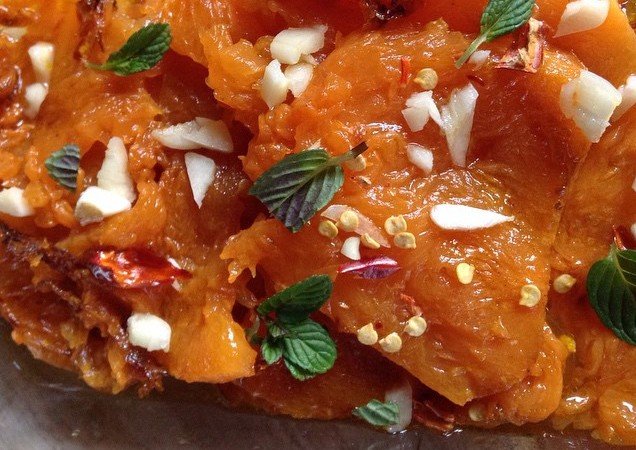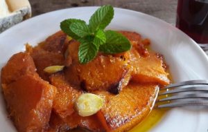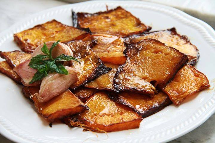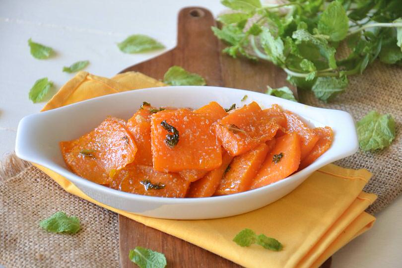 Tagliate a fette la zucca e salatela. Rosolate in olio d’oliva gli spicchi d’aglio che toglierete quando imbiondiranno e metteteli da parte. Friggetevi la zucca e rimettete l’aglio.Unite l’aceto e lo zucchero, fate bollire, quindi spegnete il fuoco. Sistemate la zucca in un piatto da portata dove la condirete con l’olio di frittura, gli spicchi d’aglio e le foglioline di menta.